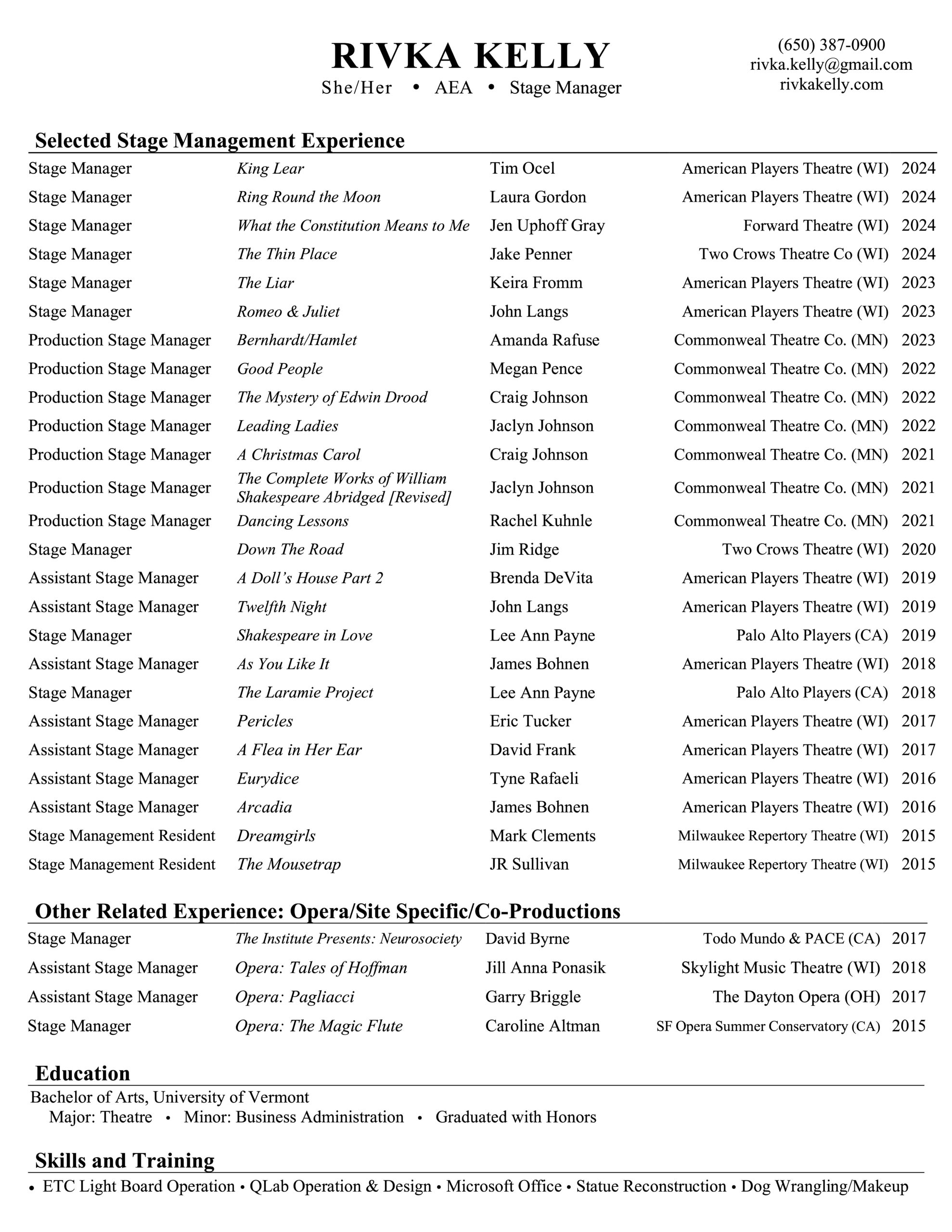 Rivka is currently Stage Managing for American Players Theatre in WI.